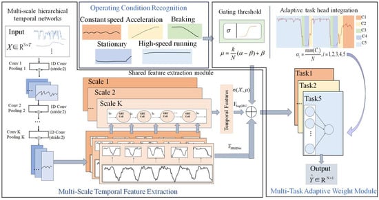 On the foundation of extracting multi-scale features, a shared module from the multi-task learning mechanism is introduced to further capture the temporal dependency characteristics within the data. The term “shared” refers to the use of a common feature extraction module across multiple tasks, which reduces the number of model parameters, improves computational efficiency, and ensures that different tasks can benefit from the same temporal features. By leveraging this shared feature extraction module, the model can more efficiently handle the complex time-series data in multi-task learning (MTL).