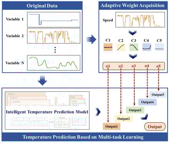 Figure 2 illustrates an intelligent temperature prediction framework based on multi-task learning. The implementation pipeline of the proposed framework can be described as follows: initially, raw time-series data collected from multiple sensors within the same bogie (e.g., speed, temperature) are fed into the model. The operating condition segmentation module automatically identifies five typical operating states of the train (C1–C5) through dynamic analysis and assigns adaptive weights (α1–α5) to each prediction head. Subsequently, the weighted raw features are concatenated and fused with the short-term/long-term dependencies of multivariate time series, critical temporal characteristics captured by the shared feature extraction module, and cross-scale temporal features extracted and integrated by the MSHNets. Ultimately, the multi-task learning architecture employs five prediction heads (Output1–Output5) deployed in parallel to model temperature variation patterns under different operating states while achieving integrated prediction outputs through inter-task feature sharing and collaborative optimization. The proposed methodology significantly enhances the accuracy and model generalization capability of bearing temperature prediction under complex operating conditions by incorporating multi-scale feature fusion and state-adaptive task partitioning mechanisms.