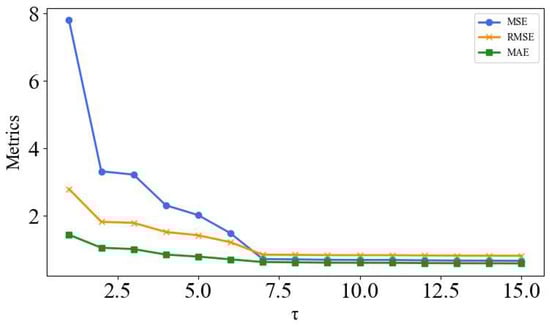 Figure 3 illustrates the variations in three temperature prediction error metrics (Mean Squared Error, MSE; Root Mean Squared Error, RMSE; Mean Absolute Error, MAE) for the MSC-Ada-MTL model across different sliding window step sizes τ (1–15). Data analysis reveals that when τ = 7, the error values reach their lowest levels; as τ continues to increase, the errors stabilize. This indicates that the model achieves optimal prediction accuracy with τ = 7. Although the error values for τ > 7 are very close to those for τ = 7, this results in shorter training times, making it the preferred parameter. This outcome demonstrates that τ = 7 not only delivers high prediction accuracy but also effectively reduces training time, significantly enhancing the model’s practicality.