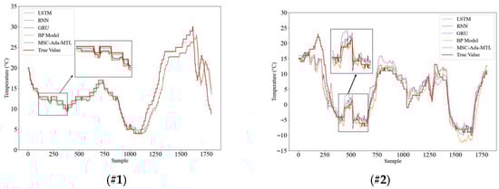 Although the BP model possesses a simple architecture, it demonstrates suboptimal performance in tasks requiring temporal dependency processing. The temporal models (e.g., LSTM, GRU) generally outperform their non-temporal counterparts (e.g., BP) in handling such data due to their enhanced capability to capture sequential dependencies. As demonstrated in Figure 4, the MSC-Ada-MTL model exhibits superior temperature tracking performance compared to baseline methods. Notably, during abrupt thermal fluctuations (e.g., steep surges or plunges), the MSC-Ada-MTL achieves precise alignment with the ground-truth temperature profile, indicating exceptional fitting accuracy. The proposed model demonstrates heightened sensitivity to thermal transients, enabling rapid adaptation to capture sharp variations. In contrast, conventional temporal models (e.g., LSTM, GRU) exhibited discernible response delays under such conditions, revealing their limited adaptability in complex scenarios.