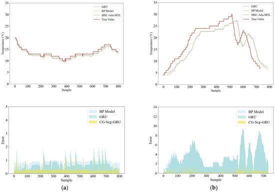 Figure 5 further elucidates the model’s dynamic response characteristics under distinct thermal variation patterns. Figure 5a demonstrates the response features under gradual temperature fluctuations, whereas Figure 5b illustrates the evolutionary dynamics in scenarios with intense thermal oscillations. Comparative analysis reveals that the MSC-Ada-MTL architecture maintains exceptional tracking precision for actual temperature trajectories, even during extreme thermal perturbations. The model exhibits remarkable environmental adaptability across critical operational phases, including thermal load ramping and transient thermal shocks, thereby confirming its technical superiority in developing comprehensive predictive maintenance strategies and expanding operational safety boundaries for bearing systems.