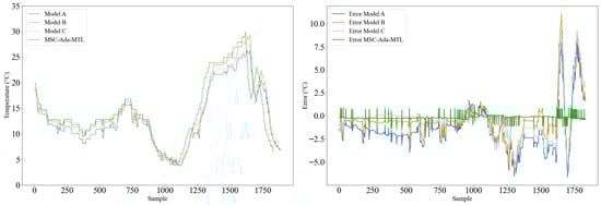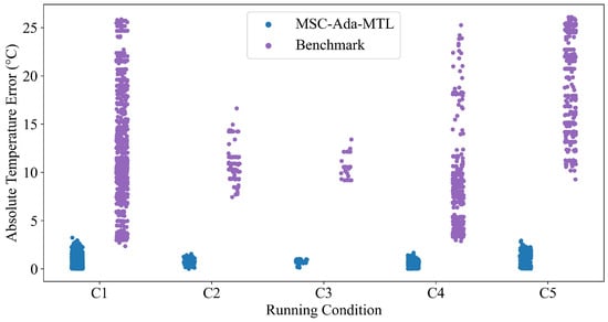 From the analysis of Figure 7 and Table 9, it is evident that the prediction accuracy of the MSC-Ada-MTL model is significantly improved compared to the benchmark model under various operating conditions. Particularly under conditions of acceleration and braking, the errors of the benchmark model significantly increase, while the MSC-Ada-MTL model maintains lower and more stable error levels. This underscores the enhanced robustness of the MSC-Ada-MTL model in handling dynamically changing operating conditions. By integrating a module that differentiates operating conditions, the MSC-Ada-MTL model effectively adapts to different operating states, thus improving the precision of temperature predictions. Moreover, even in stationary conditions, the MSC-Ada-MTL model demonstrates superior performance compared to the benchmark model, further validating its applicability and superiority across various scenarios. Consequently, the design of the MSC-Ada-MTL model significantly enhances the overall performance of temperature prediction tasks, especially under dynamic and extreme conditions. These results highlight the importance of designing specialized models for complex operating conditions.