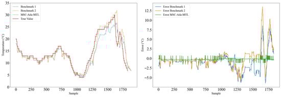 Benchmark 2: When the gating threshold unit was removed, the error in Benchmark 2 was significantly higher than that of the proposed model. This indicates that the gating threshold strategy plays a crucial role in filtering and selecting the original input information, effectively supplementing feature information and reducing unnecessary noise or interference and, thereby, enhancing the model’s overall predictive capability. This comparison highlights the important role of the gating threshold strategy in improving the model’s adaptability and robustness to temperature variations in complex dynamic environments.