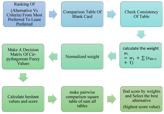 The alternatives will be represented as and the criteria will be represented as . Weights will be assigned to each criterion using DoCM, and a pairwise blank card will be used to calculate the normalized weights.