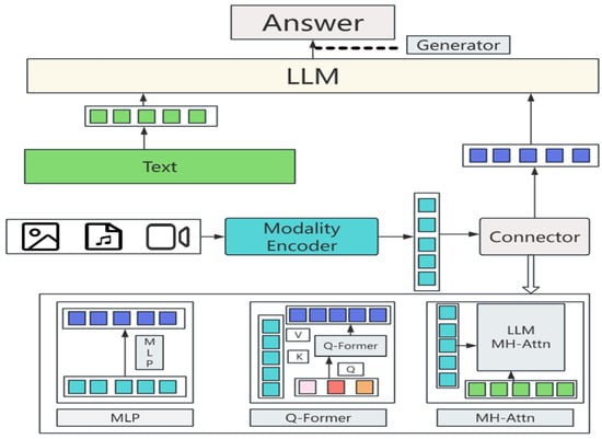 Typical MLLMs can be abstracted into three core components: a pretrained modality encoder, a pretrained LLM, and a modality connector that bridges the two (refer to Figure 1). These components play critical and interrelated roles. The modality encoder is responsible for converting raw multimodal data, such as visual or auditory signals, into feature representations that can be processed by downstream models. The LLM serves as the central intelligence engine, leveraging its powerful language understanding and generation capabilities to perform complex semantic reasoning. Acting as the bridge, the modality connector ensures effective alignment between encoded features and the LLM’s input space, thereby enabling the model to comprehend and integrate multimodal information. The synergy among these three components propels the development and application of multimodal technologies. Notably, many mainstream MLLM architectures intrinsically incorporate symmetry-oriented design principles. These include encoder–decoder structural balance, which maintains bidirectional information flow and architectural parity; modality-parallel processing pathways, which enable simultaneous and structurally analogous treatment of different input modalities; and the use of shared latent representation spaces, which enforce alignment and transformation invariance across modalities. Such symmetry-aware features facilitate more unified, interpretable, and scalable multimodal systems by reducing modality-specific biases and promoting consistent cross-modal reasoning.