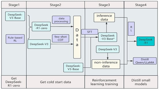 The training procedure overview is followed by a detailed analysis of each stage. In the DeepSeek-R1-Zero phase, DeepSeek-V3 acts as the agent, generating answers and reasoning processes. Correct responses or logically sound reasoning chains receive positive rewards, guiding the model to update its policy and promote higher-reward generations.