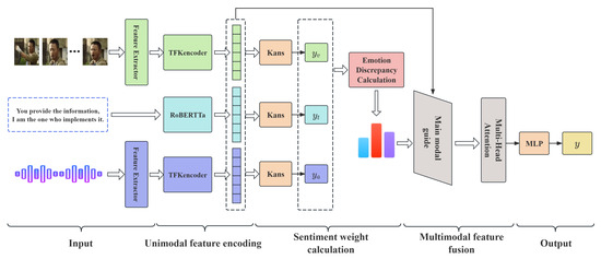 To overcome the above limitations, this paper proposes a multimodal sentiment analysis model based on KANs [8] (Kolmogorov–Arnold Networks) and the dynamic fusion mechanism (KD-MSA) which improves the model’s sentiment recognition performance by enhancing the feature encoding mechanism and dynamic fusion strategy. First, we introduce KAN-enhanced feature encoding. By using adaptive spline basis functions, KAN not only improves the nonlinear expressiveness of unimodal features but also provides interpretability through the explicit form of the basis activation functions. To our knowledge, this is the first attempt to integrate KAN into multimodal sentiment analysis. Second, we propose an asymmetric contribution-aware dynamic fusion mechanism. Unlike existing symmetric or static fusion methods, our method adaptively adjusts the weights of the modalities based on their sentiment consistency and contribution. This design enables the model to enhance the influence of the primary modality while suppressing noisy or redundant modalities, which is particularly beneficial for implicit sentiment understanding.