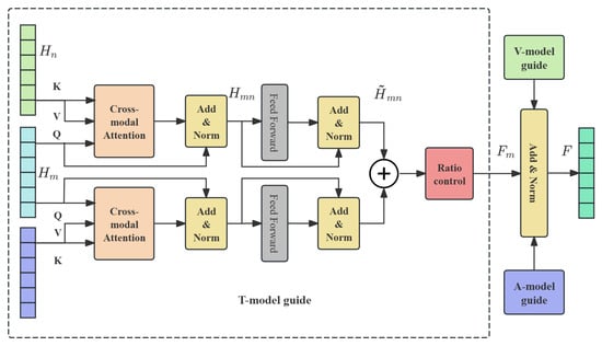 The architecture of main modality-guided multimodal fusion. The internal structure of the V-model guide and A-model guide modules is consistent with the T-model guide module structure.