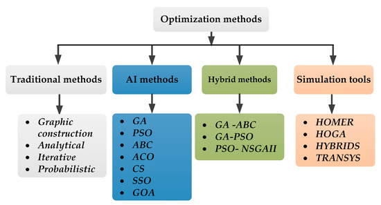 For achieving an optimal HRES, researchers have proposed a variety of optimization techniques. To achieve technically and financially optimal HRESs, researchers have proposed several optimization strategies. The best sizing of such systems can be achieved by employing approaches such as the probabilistic approach [2], graphical constructions [3], iterative techniques [4], and artificial intelligence (AI), which guarantees that they satisfy both technical and economic performance requirements.