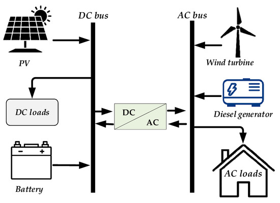- Slama, A.H.; Toumi, S.; Saidi, M.; Saidi, L. HRES systems state of the art: Topologies, sizing approaches, and evaluation criteria. In Proceedings of the 2023 International Conference on Control, Automation and Diagnosis (ICCAD), Rome, Italy, 10–12 May 2023; pp. 1–6. [Google Scholar] [CrossRef]