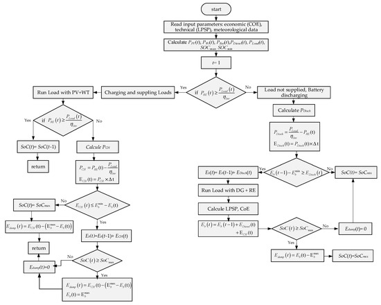 An effective energy management approach is essential for stand-alone systems to optimize the power distribution among its various components, as noted in [38]. This strategy plays a crucial role in reducing battery depletion, enhancing the utilization of RESs, and minimizing fuel consumption. A strategy is developed by incorporating meteorological data such as ambient temperature, solar radiation, and wind speed, as well as the characteristics of each component of the system such as PV, WT, batteries, DG, inverters, and loads. Within this approach, specific equations are developed and employed to govern energy management decisions.