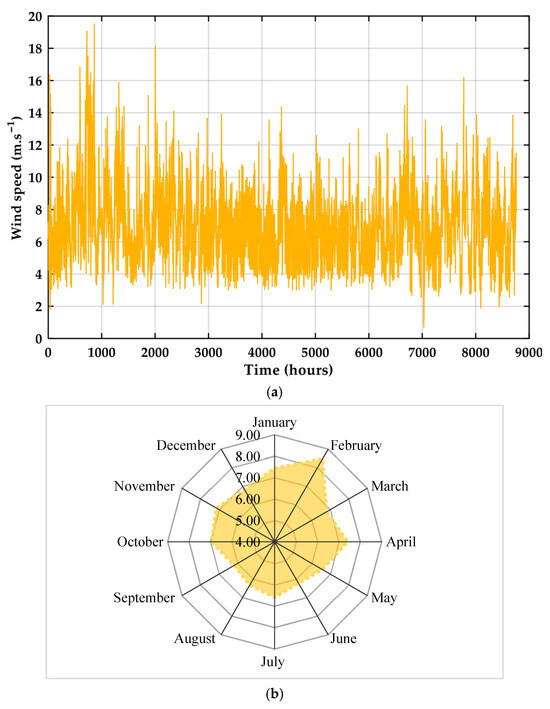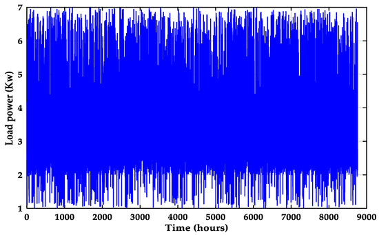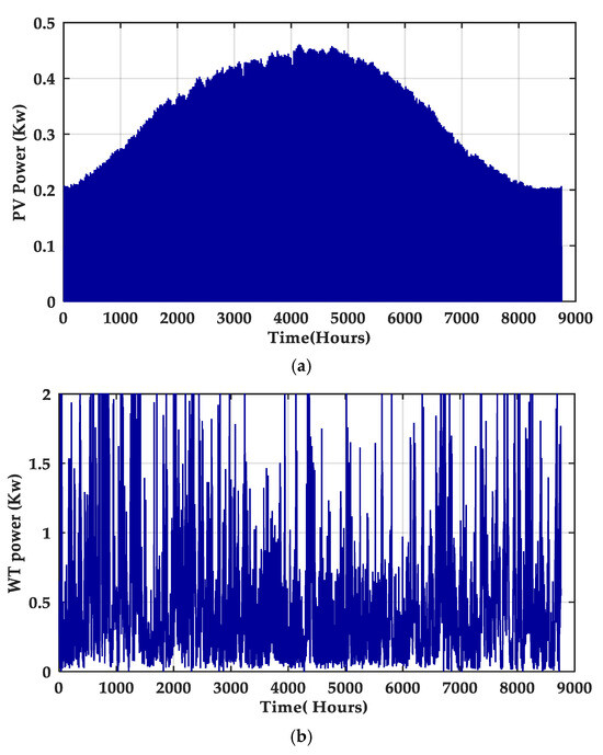 In a WT system, the WT generator begins to produce power when the wind speed surpasses the switch-on value. A steady power output is produced when the wind speed surpasses the WT’s rated speed; when the wind speed surpasses the cut-off value, the wind generator will shut off to safeguard the generator. Equation (4) describes the connection between the wind speed and the WT’s power production [35].