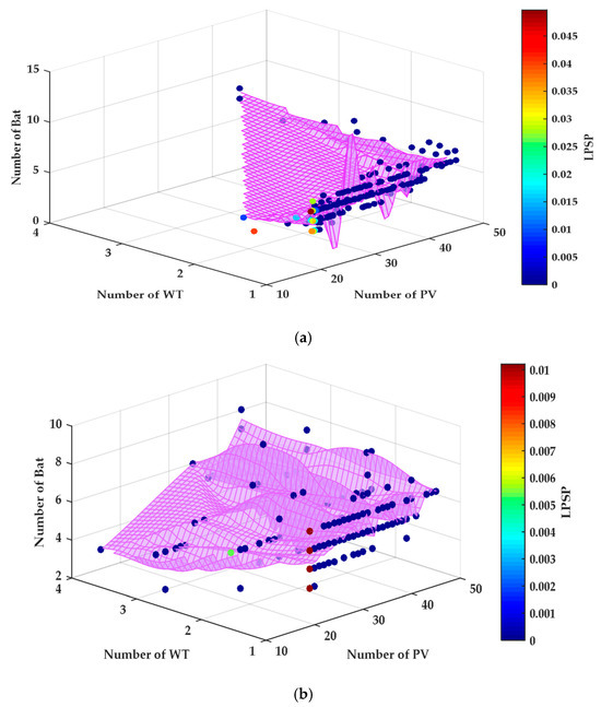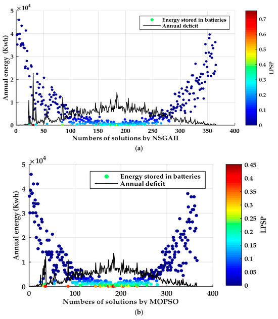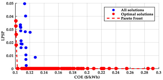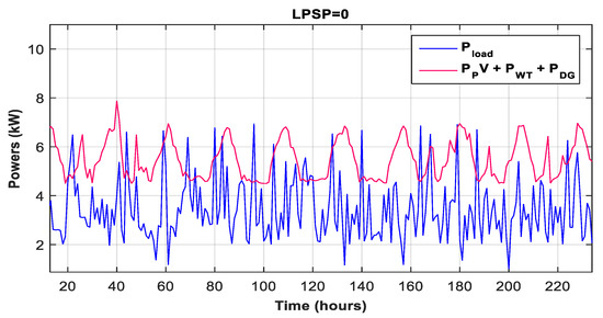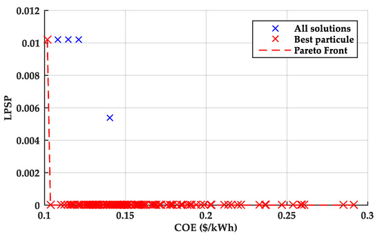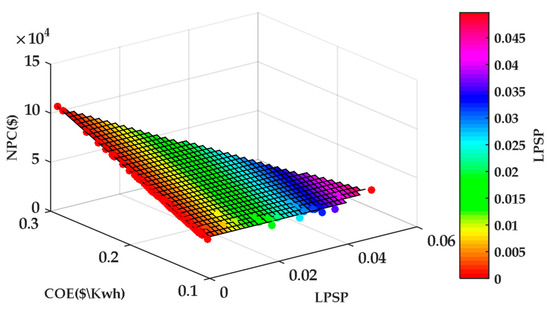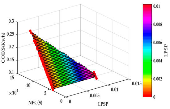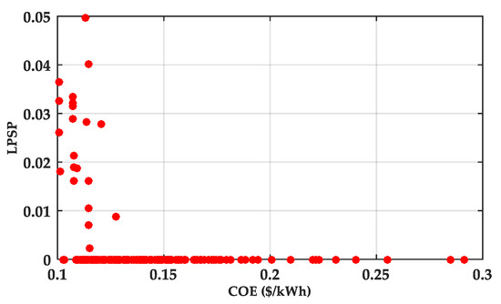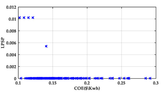 The LPSP values range from 0 to 1 (0% to 100%). All energy requirements are satisfied when the LPSP is zero. In contrast, if the LPSP equals one, the energy demand remains unmet. Accepted values of LPSP are 0.05 (5%) [39].