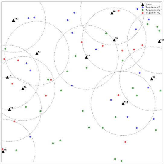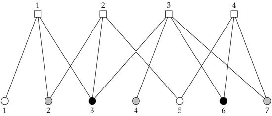 Figure 1 provides an intuitive illustration of the G-MCLP/G-PSCLP, where the red, green, and blue points represent demand points with coverage requirements of 3, 2, and 1, respectively, and the triangles denote potential facility locations with a circular service radius. A more detailed and fundamental illustration of both problems is provided by Figure 2. In Figure 2, we illustrate an example involving four facilities (represented by squares) and seven demand points (represented by circles). Each edge indicates that the corresponding facility is capable of covering the connected demand point. Specifically, white, gray, and black circles represent demand points with coverage requirements of one, two, and three, respectively. In the context of the G-MCLP/PSCLP, demand point 3 requires service by three facilities and is therefore considered satisfied only if facilities 1, 2, and 3 are all selected. Similarly, demand point 7 is considered covered only if both facilities 3 and 4 are selected. It is worth noting that under the classical MCLP/PSCLP setting, where each demand point requires service by at least one facility, selecting facilities 1, 3, and 4 would suffice to cover all demand points in Figure 2. In contrast, under the G-MCLP/PSCLP framework, selecting facilities 1, 3, and 4 covers only demand points 1, 5, and 7.