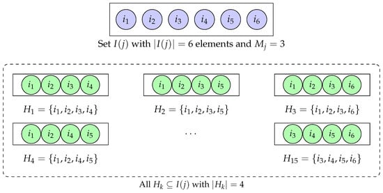 Illustration of . The purple balls represent the set of six facilities that can serve a demand point j (), which requires coverage from at least three of them (). The set consists of all subsets with cardinality , that is, the collection of subsets represented by the green balls in the figure, namely .