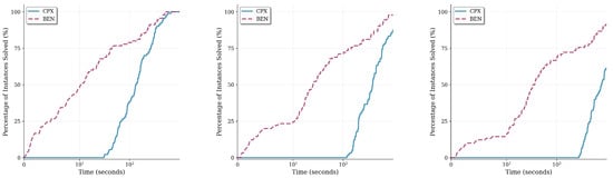 We further compared BEN with the tabu search heuristic [] (denoted as TABU) with and {10,000, 15,000, 20,000}. Since heuristic algorithms do not guarantee convergence to optimality, we evaluated the quality of solutions obtained by both methods within a fixed time limit of 10 s. For the G-MCLP instances, larger objective values indicate better solutions, whereas for the G-PSCLP instances, smaller objective values are preferred. Each row in the tables reports the average solution quality across 30 instances. As shown in Table 6, for the G-MCLP instances with budget , BEN and TABU achieve comparable performance. However, as the budget increases, BEN exhibits a clear advantage. This improvement can be attributed to the solver’s built-in heuristics, which, when combined with dynamically added Benders cuts, allow BEN to rapidly identify high-quality solutions during the iterative process. Similarly, Table 7 presents the results for the G-PSCLP instances. In this case, BEN consistently outperforms TABU across all settings within the same time limit, further highlighting the effectiveness of the proposed decomposition framework in guiding the search towards superior solutions.