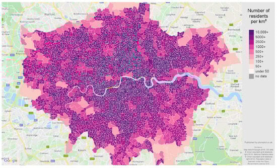 To further assess the applicability of our method to real-world problems, we employed the population distribution of London (Figure 6, data source: Plumplot https://www.plumplot.co.uk/London-population.html (accessed on 23 August 2025)) as the experimental setting. We employed a Monte Carlo sampling procedure to generate demand points according to the population density distribution, with the total number of sampled points set to 70,000. To provide a comprehensive evaluation, facility locations were randomly distributed across the map, and we tested three different scales with . The budget levels and covering demand were adopted from the ultra-large-scale experiments to ensure consistency. This setting allows us to examine the robustness and effectiveness of our approach under realistic spatial distributions.