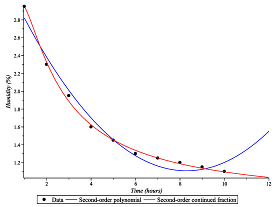 Figure 3 shows the exact data, second-order polynomial model, and second-order continued fraction model of the moisture reduction process in wood.