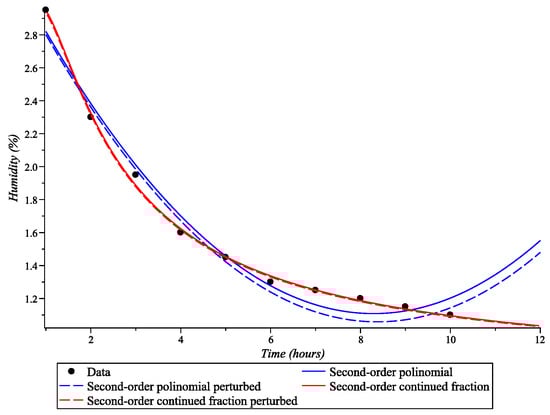 Figure 4 shows the exact data, unperturbed and perturbed to the maximum value polynomial and continued fraction models of the moisture reduction process in wood.