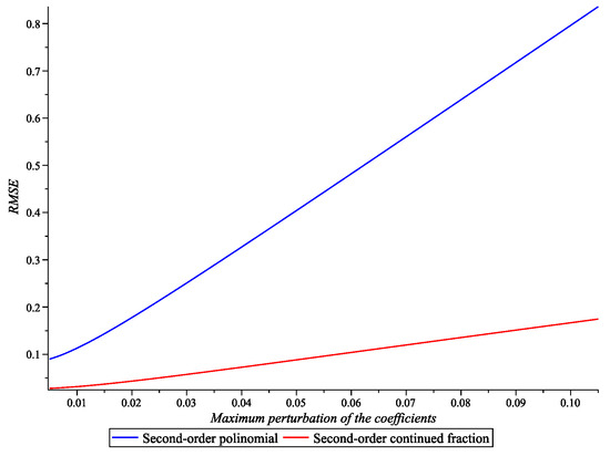The polynomial model shows a significant increase in even with small perturbations. On the contrary, the continued fraction model is characterized by a gradual and slow increase in error, which confirms its lower sensitivity to perturbations of its coefficients. It is significantly more reliable compared with the polynomial model, which is important when working with experimental or approximate data.