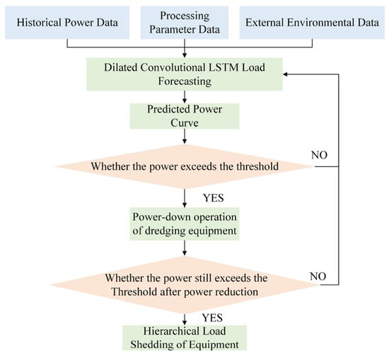 This study addresses the challenges of highly time-varying equipment loads and complex power management in trailing suction hopper dredgers by proposing an innovative “prediction-driven dynamic power management mechanism.” The mechanism features two key innovations: (1) a dilated convolutional LSTM model with enhanced load sequence prediction, improving accuracy and effectively modeling complex temporal dependencies; (2) a hierarchical dynamic power management strategy that prioritizes adjustable load reduction to maintain grid balance and selectively implements non-essential load shedding via an improved grey wolf optimization algorithm when necessary, achieving dynamic generation-load matching. Experimental results demonstrate the mechanism’s effectiveness in preventing generator overloads and power failures while enhancing system stability and critical load reliability, providing a practical solution for intelligent energy management in vessels under complex operating conditions.