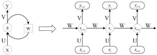 Recurrent Neural Networks (RNNs) [22,23] are a type of neural network architecture that includes recurrent connections. Compared to traditional neural networks, RNNs are designed to retain and utilize information from previous time steps through recurrent loops [24]. The RNN structure is shown in Figure 2.