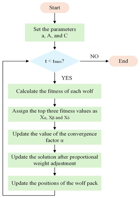 The flowchart of improved grey wolf algorithm is shown in Figure 7.