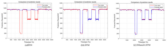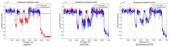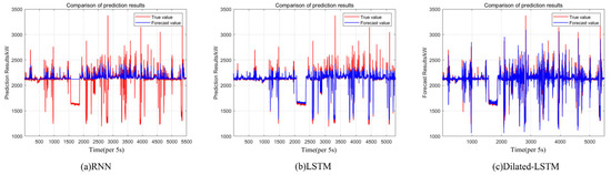As evident from the figures, the RNN demonstrates suboptimal performance in predicting left mud pump power, high-pressure flushing power, and total power. While RNNs can capture basic temporal trends, they exhibit significant limitations in modeling long-term dependencies, often resulting in prediction lag when handling complex nonlinear fluctuations during continuous operations. In contrast, LSTM achieves notably higher prediction accuracy than RNN, generally approximating the variation trends. This improvement stems from two key factors: on the one hand, LSTMs better capture the dynamic power variation patterns during dredging operations under complex working conditions; on the other hand, the incorporation of forget gates, input gates, and output gates addresses the vanishing gradient problem, thereby enhancing long-term sequence dependency learning. However, prediction inaccuracies persist, as exemplified by the failure to accurately predict certain peak values in Figure 8b and the oversimplified curve representation in Figure 9b, which inadequately captures detailed power curve characteristics, indicating substantial room for improvement.