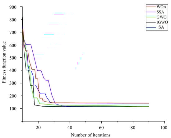 As illustrated in Figure 12, all five optimization algorithms (SSA, IGWO, GWO, SA, WOA) exhibit a decreasing trend in objective function values during the iterative process. The IGWO and GWO algorithms demonstrate the fastest initial convergence characteristics, indicating that the grey wolf algorithm family possesses significant early-stage convergence advantages. These algorithms complete the primary optimization process within 20 iterations, reducing the objective function value to approximately 100 with minimal oscillation, thereby validating the efficient exploration capability of grey wolf algorithms under swarm intelligence collaboration mechanisms.
