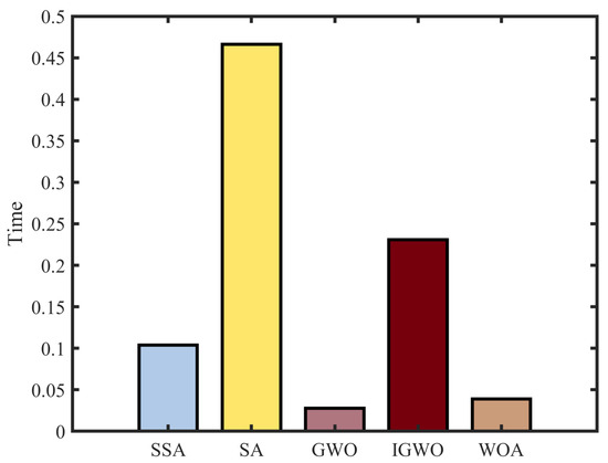 In terms of computational time, the bar chart and Table 11 data reveal significant differences among the five optimization algorithms. The SA algorithm exhibited the highest computational burden at 0.47 s, substantially exceeding other methods. In contrast, GWO demonstrated optimal efficiency with merely 0.03 s. The proposed IGWO required 0.23 s—while this represents a 0.2 s increase compared to standard GWO, our earlier analysis confirms this additional time cost yields a 51% improvement in optimization accuracy. WOA and SSA showed intermediate performance at 0.04 and 0.1 s, respectively. Overall, IGWO achieves an excellent balance between computational efficiency and solution quality, maintaining both acceptable real-time performance for most engineering applications and superior optimization precision.