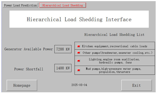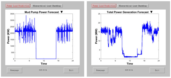 To facilitate real-time prediction and control, the proposed system was deployed on an onboard embedded computing platform. The hardware stack includes an industrial-grade ARM Cortex-A72 quad-core processor with 8 GB RAM and solid-state storage, running a lightweight Linux-based operating system (Ubuntu Core). The software stack comprises a Python 3.13-based inference engine optimized with TensorRT acceleration for neural network deployment, and real-time control scripts interfacing with the vessel’s power management system via CAN bus and Modbus protocols. This hardware-software configuration ensures low-latency response, energy efficiency, and reliable performance under maritime conditions. To complement the aforementioned load forecast-based dynamic power adjustment method, this study also developed an HMI. Figure 13 shows the 24 h power prediction trends for the mud pump and the total power generation equipment, respectively. By processing historical operating conditions and operational parameters, the system predicts the power variation in the equipment during subsequent operation.