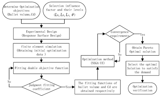 The aim of this study is to seek a rapid optimization design method for the bullet structure design of multi-objective conflicts. Based on the theory and experience of aerodynamic shape design for spin-stabilized bullets, fixed simulation boundary conditions such as flow field properties and attack angles of the bullet are selected. Using the classical aerodynamic design theory and geometric conditions of volume size for spin-stabilized bullets, the main optimization parameters for the shape of oval head bullets are chosen. According to the response surface method, these parameter objects are combined to design the optimization space. Initial optimization data is obtained by calculating these optimized shape combinations using the finite volume simulation method. Then, traditional optimization algorithms are employed to conduct optimization analysis for two objectives: the drag coefficient of the bullet and the volume of the oval head bullet. This provides a reference for selecting the optimal geometric structure parameters of oval head bullets under different working conditions. The optimization process is illustrated in Figure 2. This study effectively enhances the design efficiency by combining the response surface method with the NSGA-II algorithm in the optimization design of the shape selection for bullets. It successfully resolves the conflict between the aerodynamic drag coefficient and the volume of the bullet.