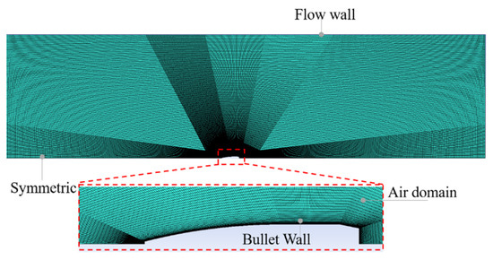In the Fluent software, the flow field calculation conditions are set to near-ground meteorological conditions, with the incoming gas treated as an ideal gas with a Mach number of 2, and Sutherland viscosity employed. The attack angle is set to horizontal. The bullet surface adopts a no-slip adiabatic solid wall boundary condition, while the outer boundary of the flow field employs a pressure far-field boundary condition. The lengths of the flow fields in the front and rear areas of the bullet in the far-field region are set to 13 times the length of the bullet, and the width of the side flow field of the bullet body is set to 38 times the diameter of the bullet. To improve the capture accuracy of the laminar flow influence on the bullet surface, the mesh area is encrypted near the body wall boundary layer of the bullet, with the first layer height set to less than 2.4 × 10−7 m. The boundary layer is extended in 20 layers with a growth factor of 1.2. In Figure 4, it shows the position of the bullet in the computational domain and the size ratio of the domain. It clearly marks the settings of boundary conditions such as inlet (velocity inlet), outlet (pressure outlet), wall (no-slip wall), and symmetry plane.