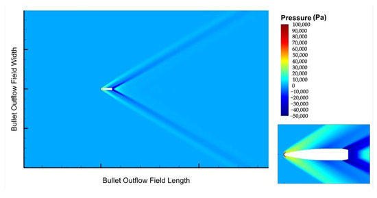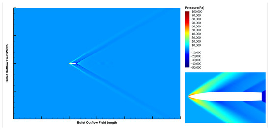 Based on the optimal combination of the main parameters for the shape of the oval head bullet obtained through the response surface method and NSGA-II algorithm in Section 3.3, a new analysis model is established for simulation analysis under the condition of maintaining other variables unchanged. The new model is set with a head length of 47.12 mm, a body length of 40.36 mm, a tail length of 29 mm, and a tail angle of 5.14°. Under near-ground meteorological conditions, the incoming gas flow is considered as an ideal gas with a Mach number of , and the attack angle is set to horizontal 0°. The simulation results indicate a drag coefficient of 0.2312 for the oval head bullet. The pressure contour of the supersonic external flow field for the bullet is shown in Figure 9. It can be observed that under the optimal dimensions for the oval head bullet shape, the drag coefficient obtained from the simulation differs from the predicted value of the NSGA-II algorithm by approximately 4.84%. This suggests that the optimization predictions made by the NSGA-II algorithm are relatively accurate and effective, demonstrating their practical value. Some reasons are considered to cause this deviation. The local fitting accuracy of the response surface model decreases under supersonic conditions. Systematic errors are introduced by mesh division and turbulence model assumptions in the CFD numerical simulation process. There is a deviation between the excessively high precision of the optimization results and the CFD calculation results.
