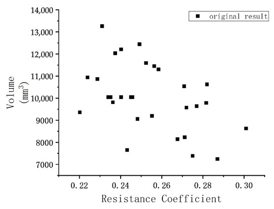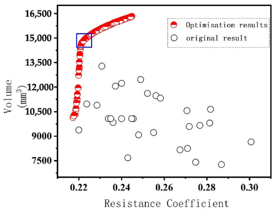 - The leftmost point among the 100 optimized solutions represents the minimum drag coefficient, with the smallest volume. Conversely, the rightmost point represents the maximum drag coefficient, with the largest volume.