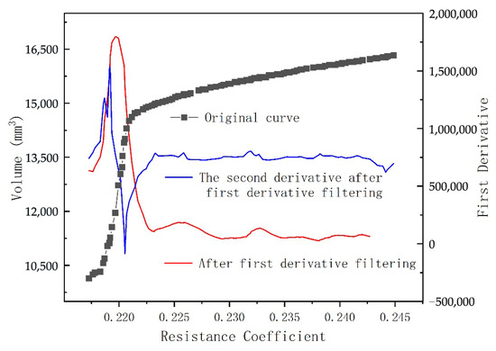 Using the software Origin, the set of 100 optimized solution points in Figure 7 is sorted according to the drag coefficient to generate a curve, as shown in Figure 8. First-order derivative filtering is applied to this curve, followed by the calculation of the second-order derivative. It can be observed that the second-order derivative curve exhibits a minimum value in Figure 8. This value geometrically signifies the point where the distribution of optimized solutions begins to change direction, indicating a shift in the distribution inflection point. At this point, the increase in drag coefficient starts to significantly outpace the increase in volume. In Origin, the drag coefficient value at this inflection point is determined to be 0.22053, with a corresponding bullet volume of 14,005.21 mm3. The four optimized parameters for the oval head bullet shape corresponding to this point in the optimized solution set are: Lh = 47.21 mm, Lb = 40.36 mm, Lr = 29 mm, ψ = 5.14°.
