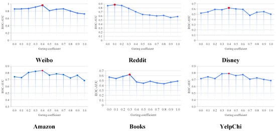 The ROC-AUC performance of DPGAD when setting different gating coefficient values on Weibo, Reddit, Disney, and Books. The gating coefficient with the best performance is marked with a bold red dot.