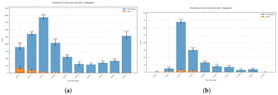 The distribution of the gating coefficient after training 500 epochs on (a) Weibo and (b) Disney. Blue is the proportion of all nodes, and orange is the proportion of abnormal nodes.