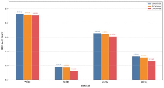 DPGAD maintains consistent performance across multiple datasets under varying noise levels (10%, 20%, 30%). While the AUC-ROC scores decrease with higher noise levels, the marginal degradation remains within acceptable thresholds, demonstrating the model’s noise tolerance. Notably, on the Weibo and Disney datasets, DPGAD shows less than 3% performance drop when noise increases from 10% to 30%, indicating superior robustness. Section 4.5.2 further reveals that DPGAD primarily relies on structural similarity features, which explains its resilience to attribute noise across all four datasets.