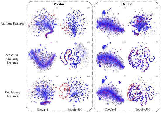 We concatenate the node attribute features and structural features and then calculate the gating coefficient through a linear layer. is learnable parameter matrix, is the bias, and is the sigmoid activation function, ensuring the gating coefficient is between 0 and 1. Then, adaptive fusion is performed through Equation (17) to obtain the fusion feature. When the gating coefficient value is larger, the model pays more attention to the attribute characteristics of anomalous nodes, and when the gating coefficient value is smaller, the model pays more attention to the structural characteristics of anomalous nodes. This method enables the model to automatically adjust the focus according to the actual situation of the node, thereby being compatible with a variety of anomalous types.