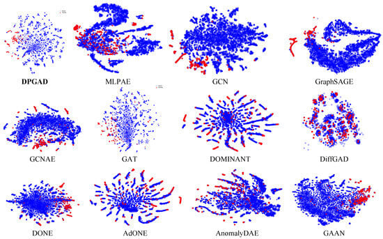 The visualization results demonstrate that DPGAD achieves sharper cluster separation between normal and anomalous nodes, with minimal overlap between the two categories. Although GCN and GraphSAGE show clear clustering effects for anomalous nodes, they fail to effectively separate anomalies from normal nodes, resulting in significant overlap regions between them. This limitation leads to their inferior performance compared to DPGAD. This observation indicates DPGAD’s enhanced sensitivity and precision in detecting structural anomalies within graph data. Notably, DPGAD maintains robust detection performance on the Weibo dataset, effectively identifying anomalous nodes despite their low population ratio (10.3%). This confirms DPGAD’s exceptional capability in detecting minority anomaly groups within imbalanced graph datasets.