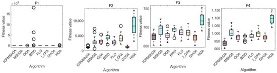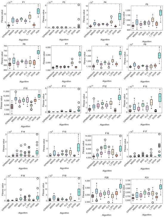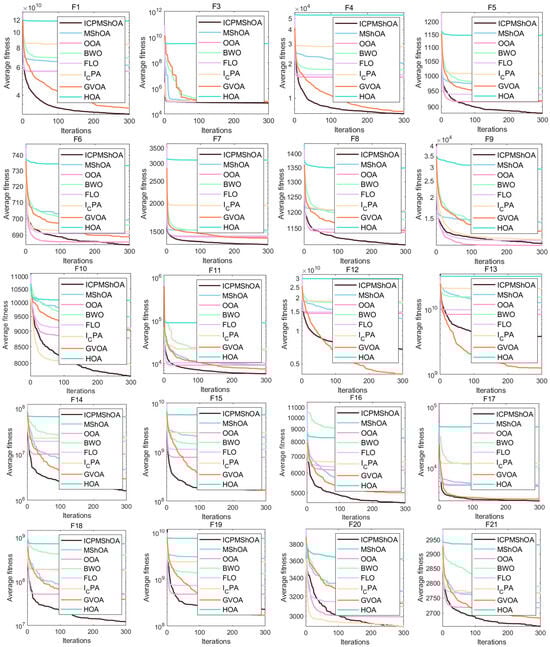 In general, the ICPMShOA performs outstandingly in most function tests, showing notable differences from and often being better than other algorithms. Even when its performance is like that of some algorithms in certain functions, its advantages remain distinct, which confirms that it has strong competitiveness in solving these benchmark problems.