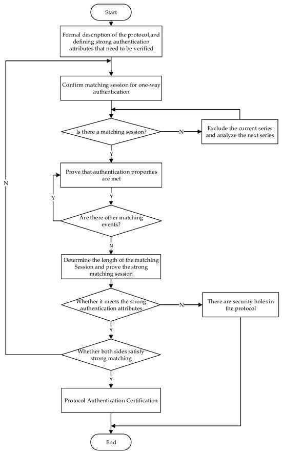 The verification process based on the Logic of Events Theory to verify the strong authentication of security protocols for two-party entities is shown in Figure 1.