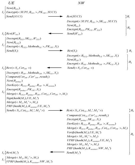 Many studies have used automated verification tools to check the security properties of the protocol. Zhang et al. formally modeled the EAP-TLS protocol and used the automatic verification tool Scyther to formally verify the EAP-TLS protocol model and found out the security vulnerabilities of the protocol. They proposed the improvement strategy according to the vulnerability, but they did not calculate the communication consumption brought by the improvement strategy [15]. Chen assumed that the channel was an insecure channel and used ProVerif to verify the formal model of the EAP-TLS protocol. It was found that the authentication between user equipment and network could not be satisfied under the insecure channel. They also did not calculate the communication consumption brought by the improved strategy [16]. Wang et al. used the Diffie–Hellman interaction model and the extended Dolev–Yao attacker model to find the security risks of the protocol in confidentiality and authentication through the automatic verification tool SmartVerif. However, the high complexity of the tool resulted in limited scalability [17].