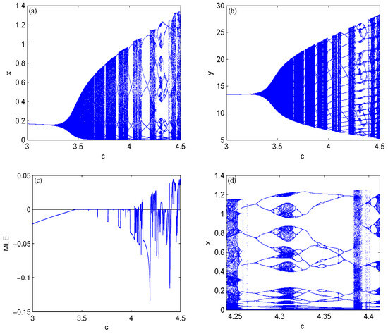 (a) Neimark–Sacker bifurcation diagram of model (4) in space. (b) Neimark–Sacker bifurcation diagram of model (4) in space. (c) Maximum Lyapunov exponent. (d) Magnification of (a) for .