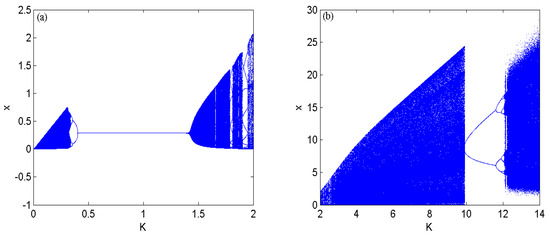 The carrying capacity of the prey population serves as a pivotal determinant of ecological system behavior. Through systematic variation of this parameter within a discrete-time predator–prey model, Rajni and Bapan [7] uncovered compelling dynamical transformations, notably the emergence of Neimark–Sacker bifurcations following flip bifurcations. Adopting a complementary parameter regime defined by , our analysis corroborates this bifurcation sequence, as evidenced in Figure 3a. Additionally, Figure 3b demonstrates that incremental increases in K precipitate the formation of two equilibria, , , whose respective y-components vary directly with K. In accordance with Theorem 1, the existence of two positive fixed points is assured when K exceeds the threshold value .