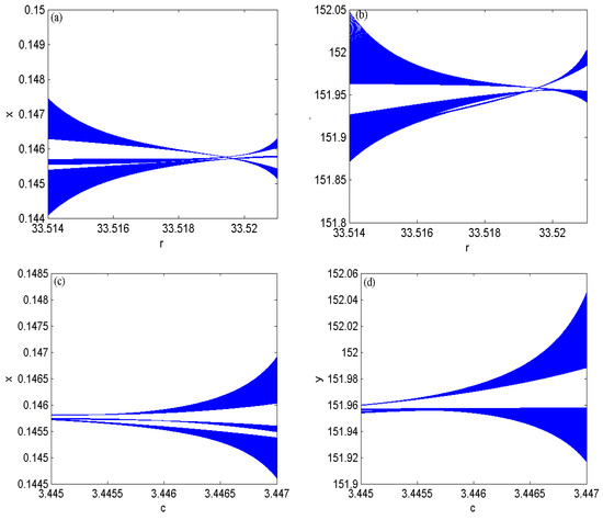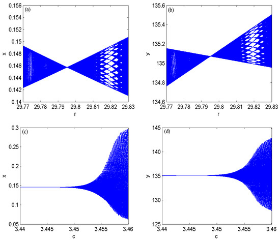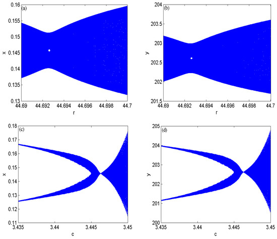 (a,b) Bifurcation diagram of model (4) in space and space. (c,d) Bifurcation diagram of model (4) in space and space.