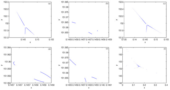 Phase portraits corresponding to Figure 10. (a) ; (b) ; (c) ; (d) ; (e) ; (f) .