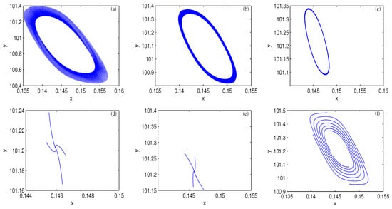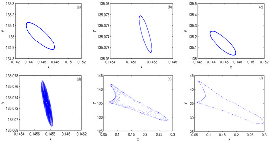 Figure 8 illustrates the bifurcation diagrams as the parameters r and c vary near . The corresponding phase diagrams appear in Figure 9. From Figure 9a–c, it is evident that a closed invariant circle bifurcates from the fixed point when and r increases slightly above 22.26. Conversely, fixing reveals in Figure 9d–f that four invariant circles materialize from a period-4 orbit as c increases from 3.441 to 3.4456. The phase portraits highlight the region where the 1:4 resonance takes place, potentially crucial for the development of complex dynamics.