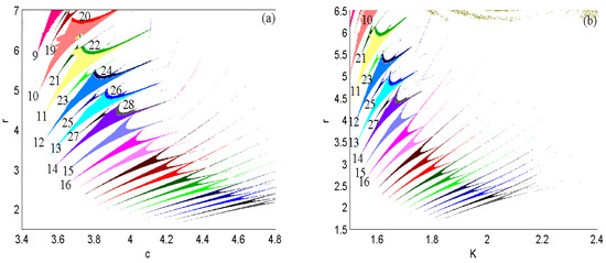 Building upon the analyses in Section 3 and Section 4, our investigation reveals that the conversion coefficient c, the carrying capacity K, and the intrinsic growth rate r are fundamental determinants of prey growth and overall system dynamics. Accordingly, we treat c, K, and r as key control parameters for a detailed exploration of system (4). Through extensive numerical simulations utilizing various analytical tools, we aim to uncover novel dynamical phenomena. Our analysis extends to mapping the system’s behaviors in the and parameter planes, with corresponding isoperiodic diagrams presented in Figure 12.